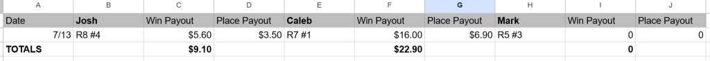We went 2 for 3 yesterday! Caleb picked up a nice $16.00 winner with Into Happiness and Josh got a Three Cherry Special with Sea Cottage. Mark will promise to do better.