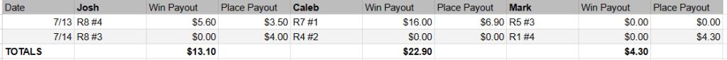 After yesterday’s disappointing off the turf performance, we come back today with a few stakes and turf racing. Mark was able to get on the board with a place horse yesterday and Josh added to his total with a chalky place horse as well.