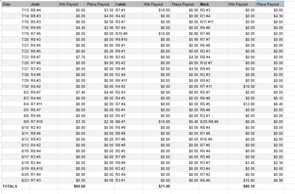 It finally happened. We let the closer stay in the race too long and Mark has leapfrogged Josh and Caleb to take the lead with a nice $16.80 winner yesterday.