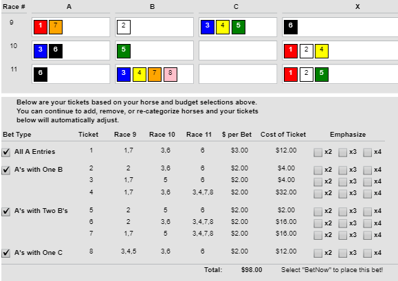 Race 9 – #1 Mrs. Sippy is the logical here and I want the most of her along with a bunch of last years winner #7 Fools Gold. I made Beau Belle a B just in case she gets loose and speed carries like it did yesterday. I grabbed the rest of the runners as C’s more for defense than anything.